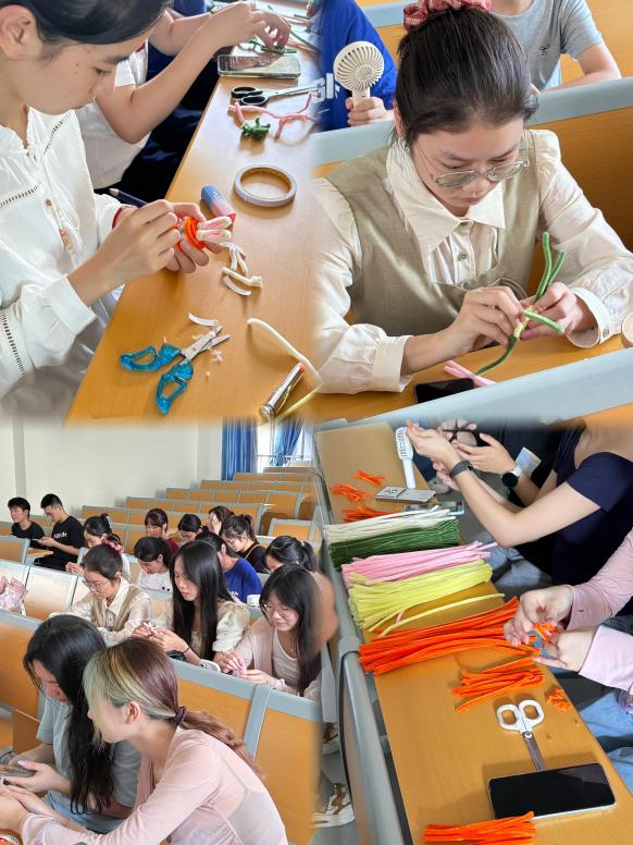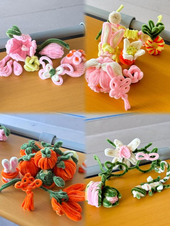 “玩转中秋”——在活动现场热闹非凡,同学们积极参与用扭扭棒制作中秋糕点的活动。扭扭棒在同学们的巧手下,变成了一个个造型别致、色彩鲜艳的“中秋糕点”。大家充分发挥自己的想象力和创造力,有的同学制作出了精致的月饼形状,上面还细心地添加了“花纹”;有的则别出心裁地将“糕点”设计成了可爱的小动物造型,赋予了传统中秋元素新的活力。