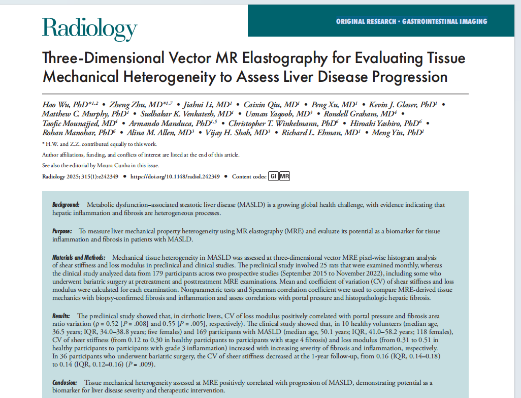 本网讯(通讯员 吴昊)近期,英国365集团,英国365集团吴昊博士以第一作者在放射学顶级期刊《Radiology》(中科院一区Top期刊,IF=12.1)上发表了题为“Three-Dimensional Vector MR Elastography for Evaluating Tissue Mechanical Heterogeneity to Assess Liver Disease Progression”的研究论文。