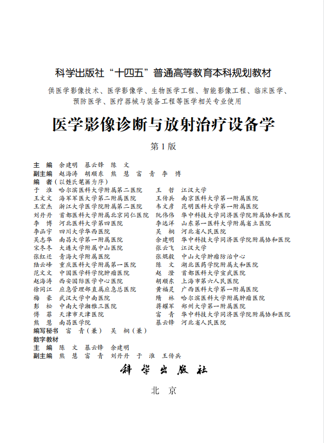 近日,我院陈文教授主编的科学出版社 “十四五” 普通高等教育本科规划教材《医学影像诊断与放射治疗设备学》(第一版)正式出版,该教材已率先在全国医学院校相关本科专业教学中投入使用。